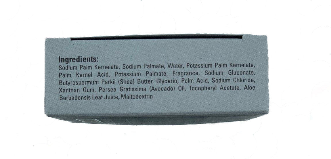 Ingredients: Sodium Palm Kernelate, Sodium Palmate, Water, Potassium, Palm Kernelate, Palm Kernel Acid, Fragrance, Potassium Palmate, Glycerin, Sodium Gluconate, Butyrospermum Parkii (Shea) Butter, Palm Acid, Sodium Chloride, Xanthan Gum, Persea Gretissima (Alvocade) Oil, Tocopheryl Acetate (Vitamin E), Aloe Barbadensis Leaf Juice, Maltodextrin,
