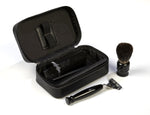 3pc. Black Travel Shaving Kit includes Mach 3 Razor w/black handle, Badger Shave Brush w/black handle, and Leather Zipper Case. Plenty of room to add your personal items.