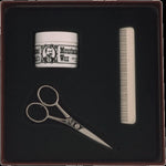 Set includes 4 1/4" moustache/beard scissor, 4 3/4" comb, wax (1 oz.). Gift boxed.