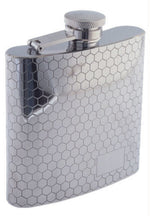 This 6 oz. stainless steel flask slides easily into a jacket or pants pocket. It's curved to fit the hip.This flask has a beautiful honeycomb pattern. The front lower right hand corner has a rectangle suitable for engraving. Top and bottom are rimless with a hinged cap.