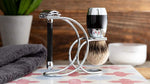 The perfect gift, the MERKUR Model 2081 3-piece shaving set is featuring the classic 20C twin colour razor with a matching silver tip badger shaving brush, and a stand to hold all the components. The entire set is finished in a polished chrome finish with black anodized elements.