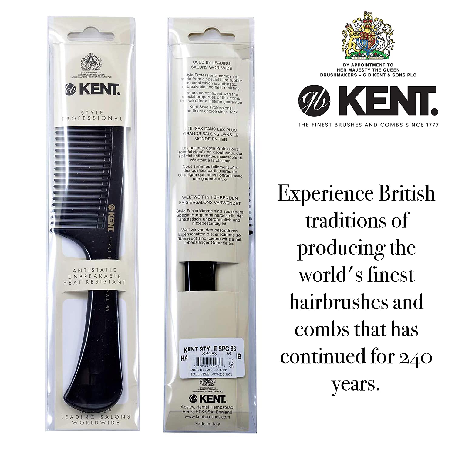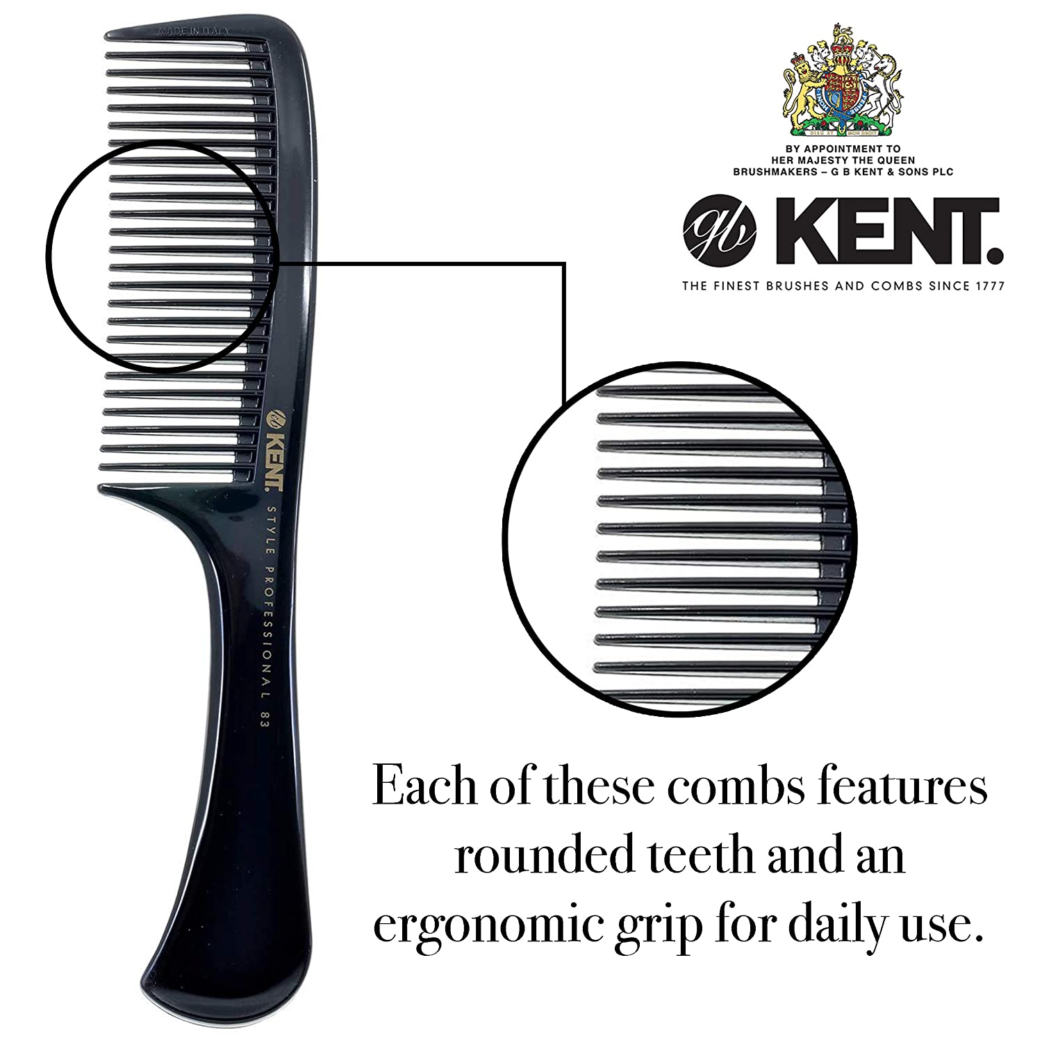 Peigne à râteau à manche Kent 220MM Peigne de style salon noir élégant, avec une finition professionnelle caoutchoutée. Chacun de ces peignes est fait à la main, avec des dents arrondies et une prise ergonomique pour un usage quotidien. Les dents arrondies des peignes Kent stimulent le cuir chevelu pour soulager les huiles et rajeunir vos cheveux. Les cheveux régulièrement exposés aux huiles naturelles du cuir chevelu ont plus d'éclat et de volume, évitant ainsi le grisonnement et les larmes.