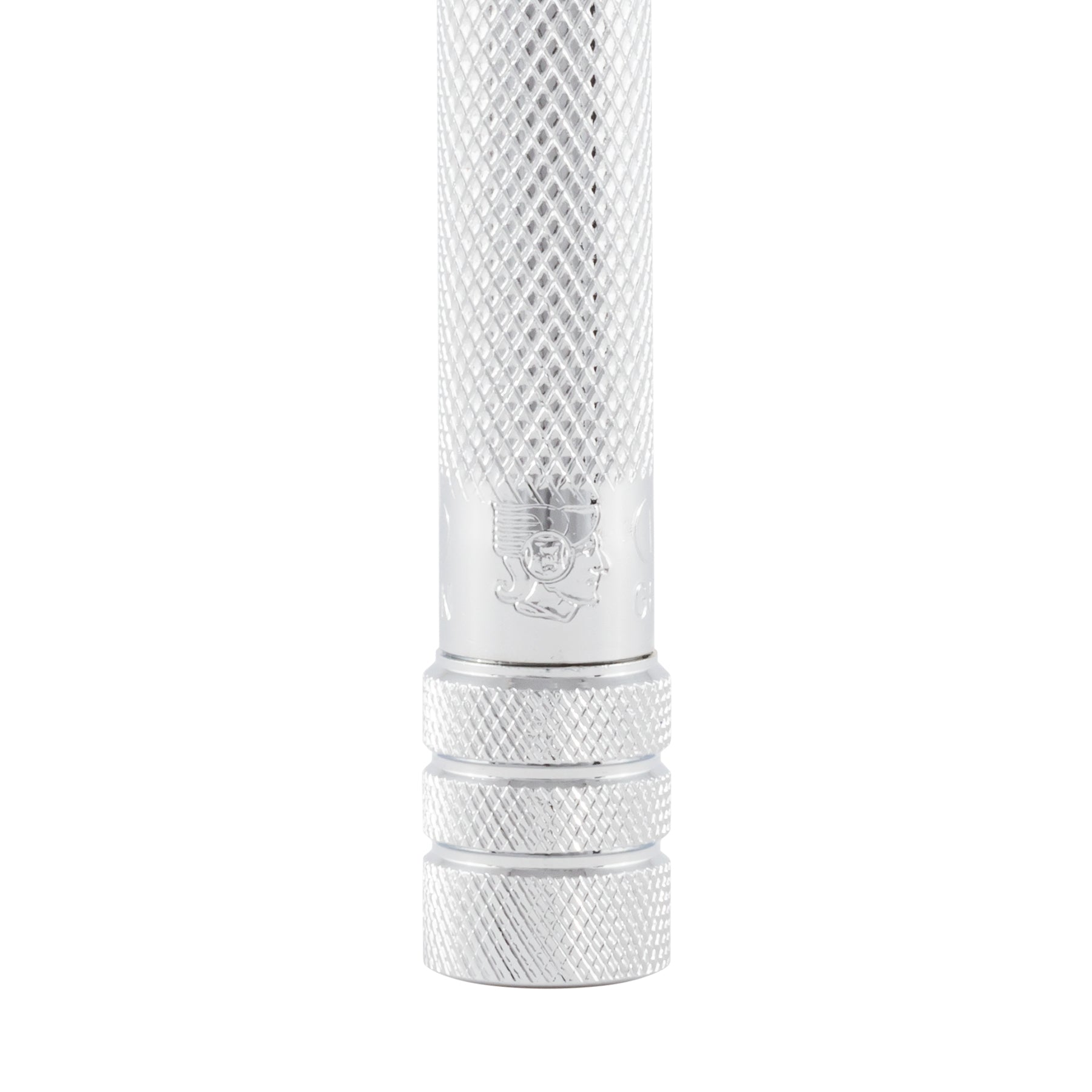 Ce rasoir de sécurité Merkur à double tranchant contient un manche extra long avec une brillance chromatique. Conçue pour un rasage de près et facile, la lame fixe est fabriquée avec un siècle d'expertise.