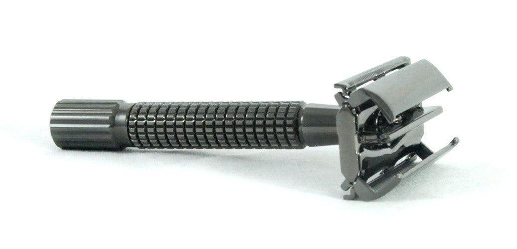 This is a classic butterfly style double edge razor. Turn the knob at the bottom of the handle and the head opens like butterfly wings. Place blade in the open head, turn the knob in the opposite direction to close the head and secure the blade. The handle has a non-slip grip. The finish is a high polished charcoal color. This is a great entry level razor.