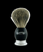 A combination of chrome and faux ebony produce a striking handle on this mixed badger hair shave brush. Not just good looks, but it feels great in your hand. A full head of blended best and pure badger (mixed badger) makes mountains of lather in no time.