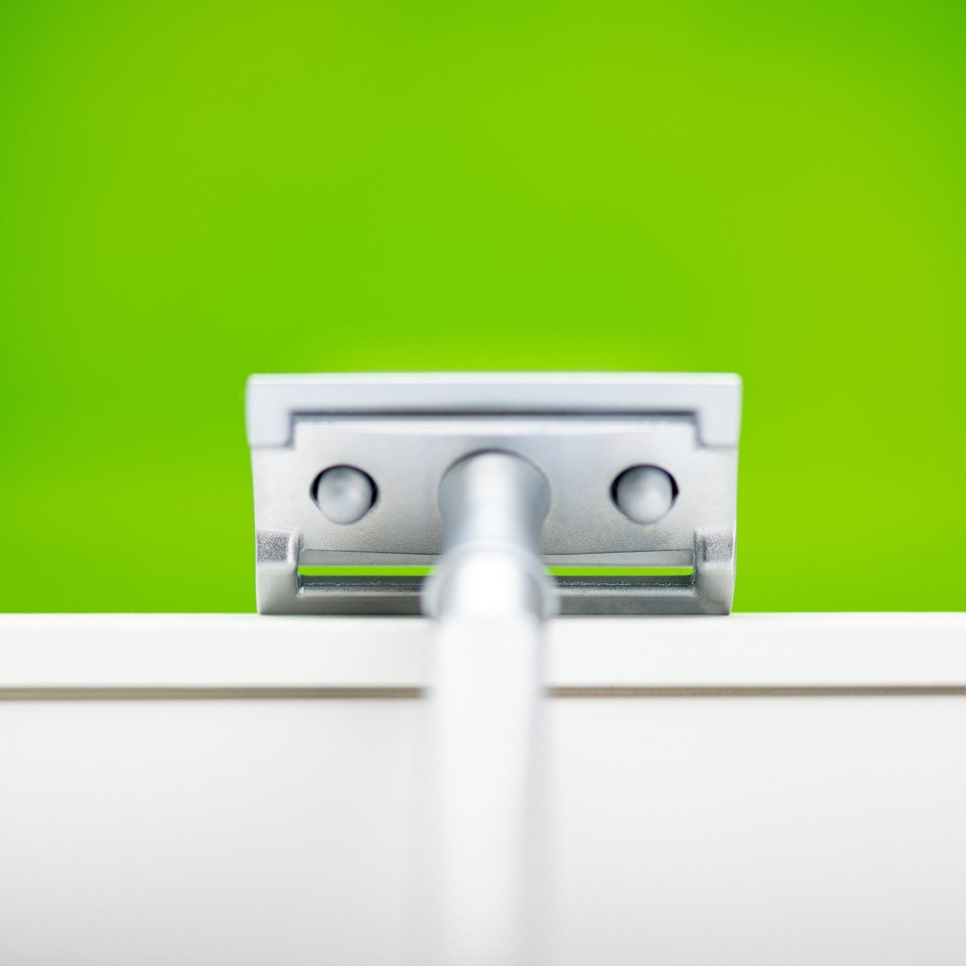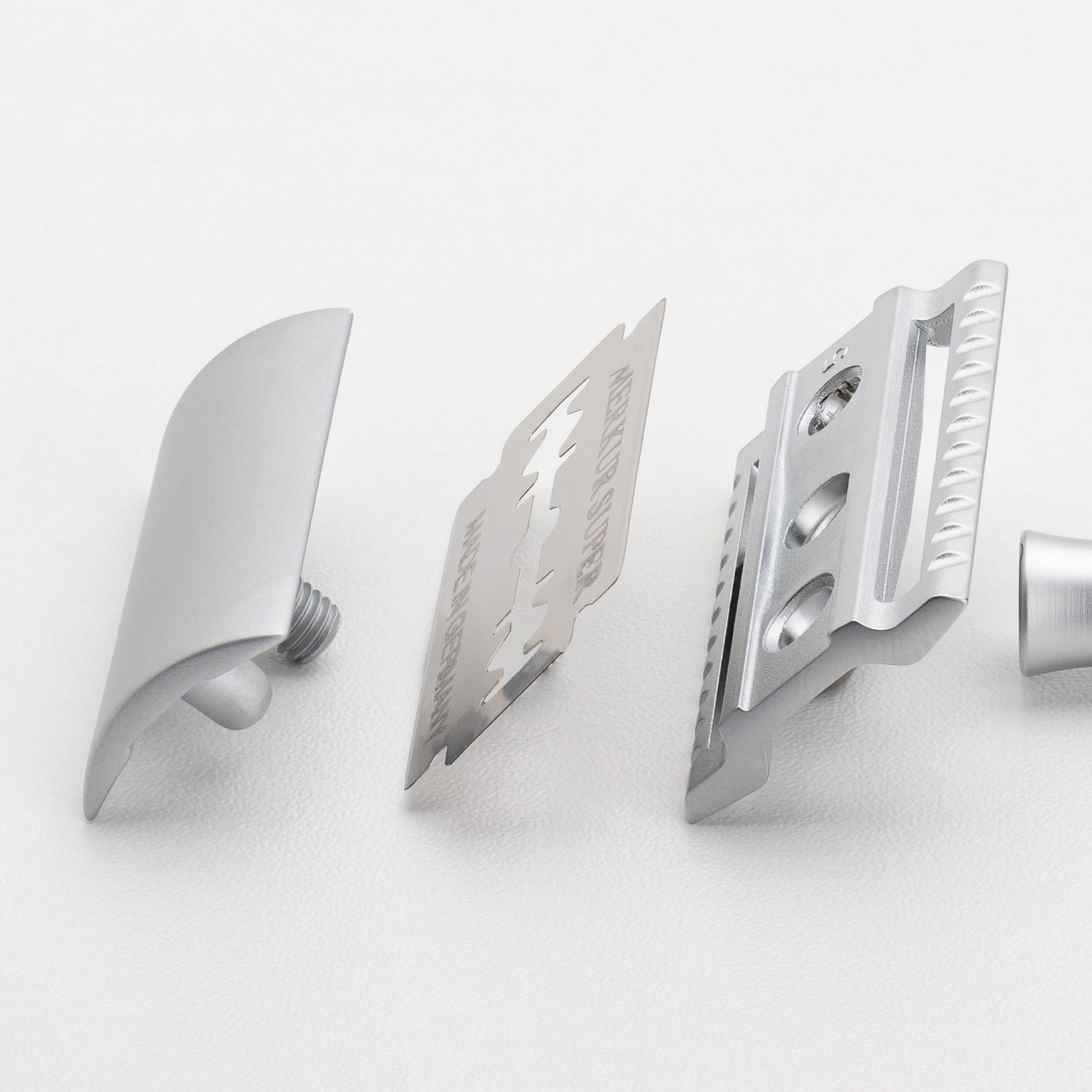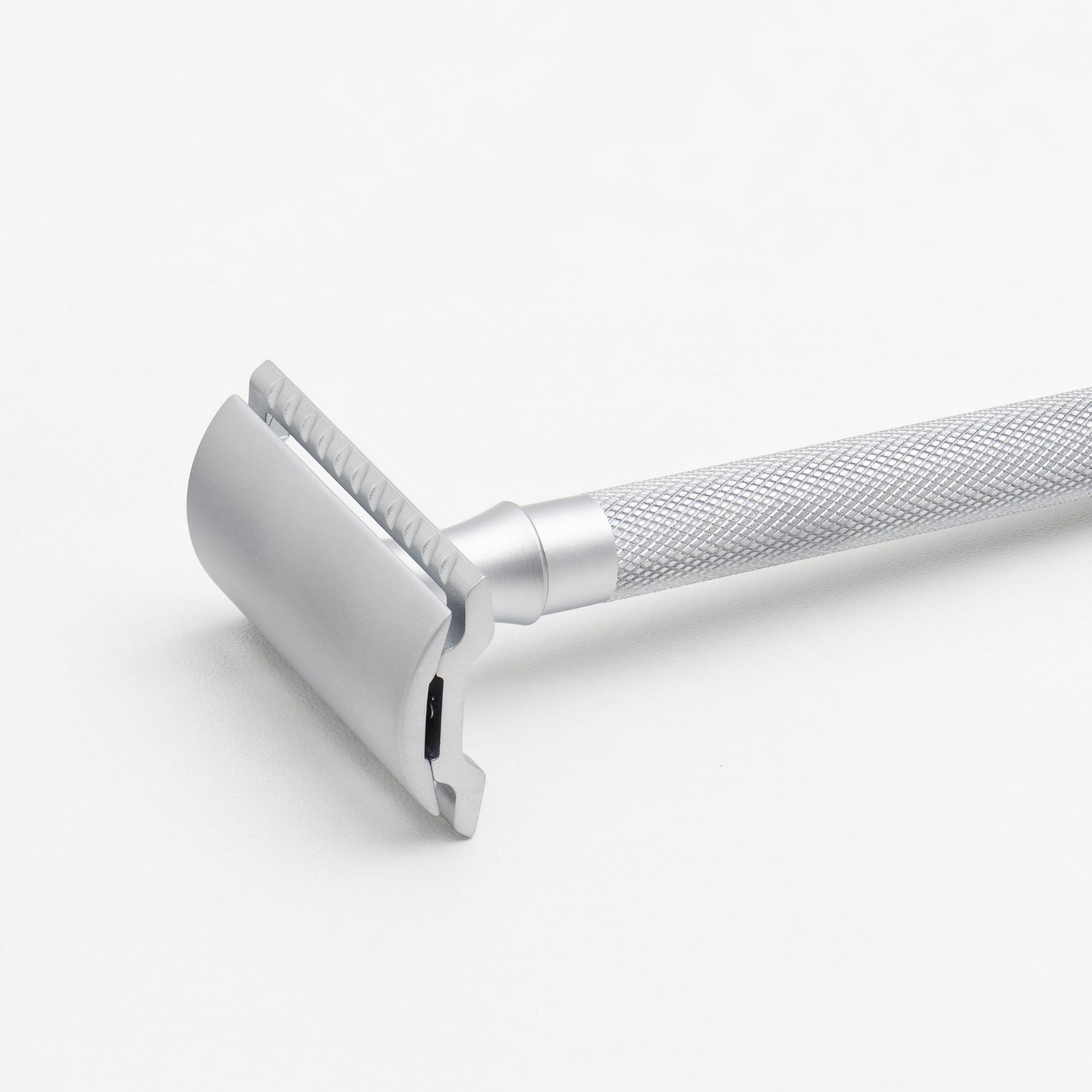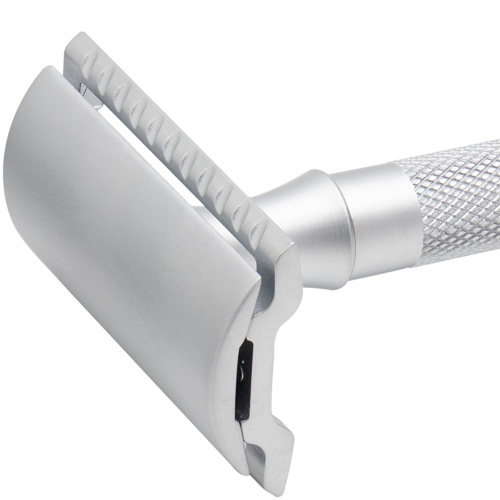 Le long manche permet un rasage en douceur et le peigne fermé est polyvalent pour le rasage humide classique. L'espace généreux entre les lames permet un débit de savon élevé, protégeant la tête du rasoir de l'encrassement par les cheveux coupés ou les résidus de mousse.