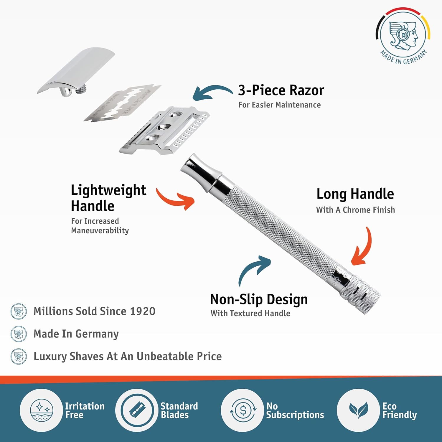 This Merkur Double Edge Safety Razor contains an extra long handle with chromatic shine. Made for a close and easy shave, the fixed blade is crafted with a century of expertise.